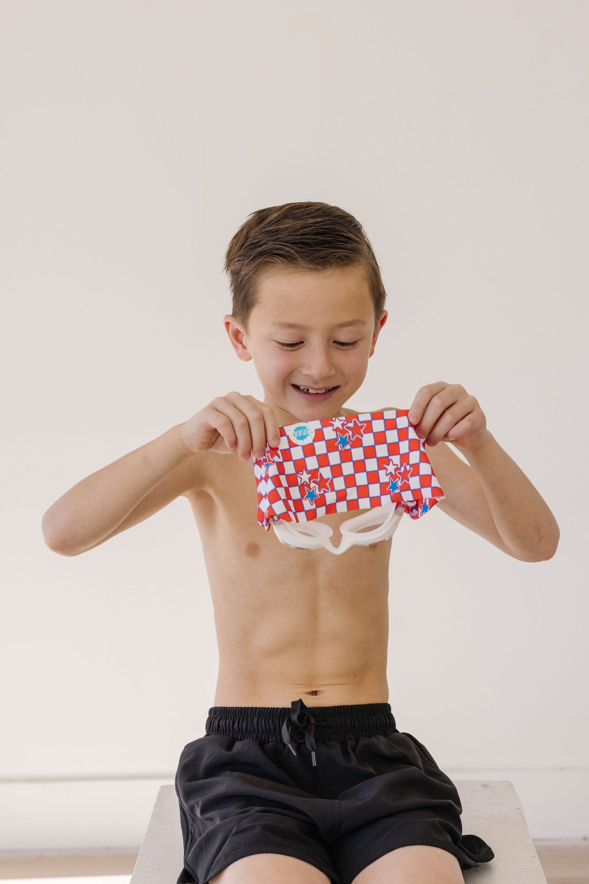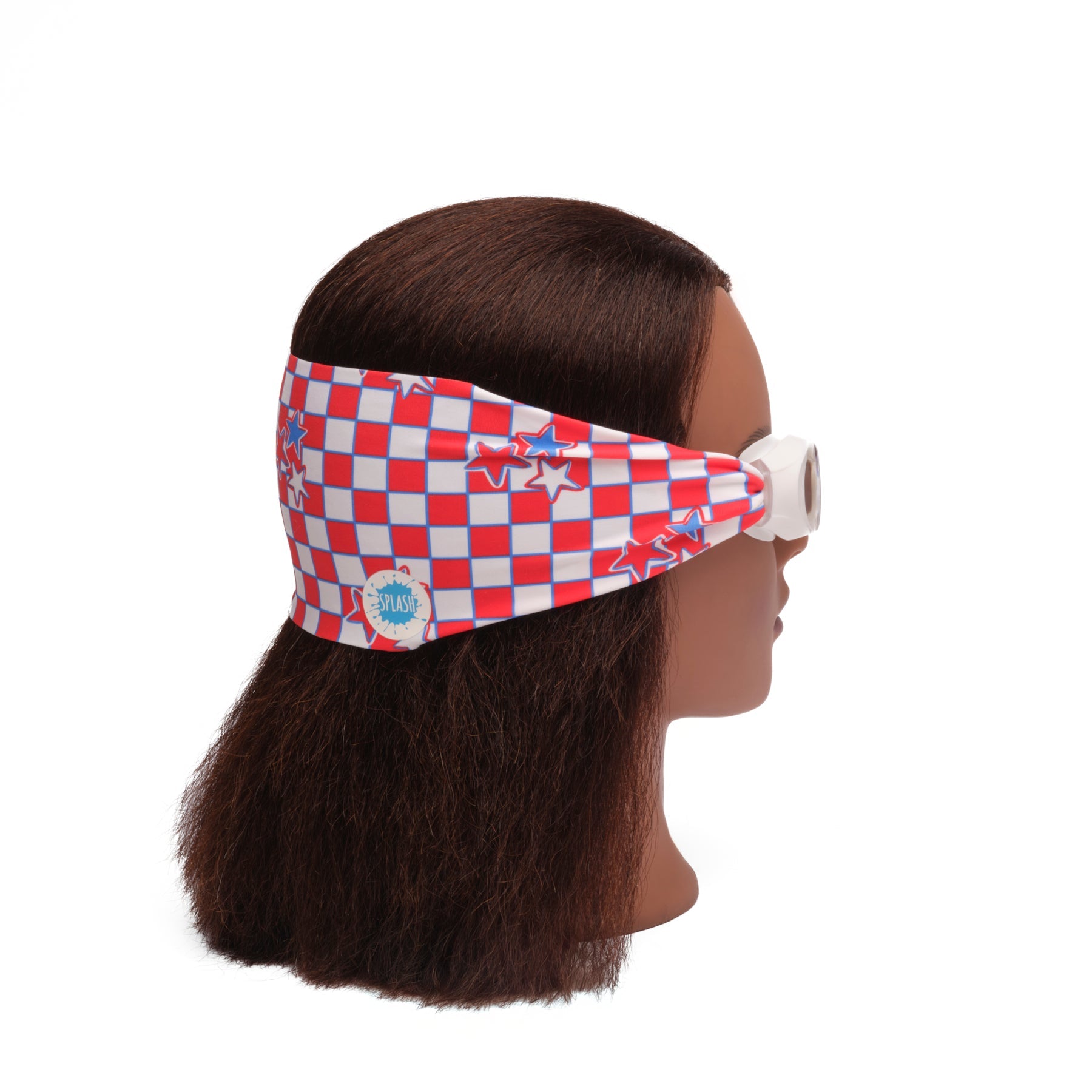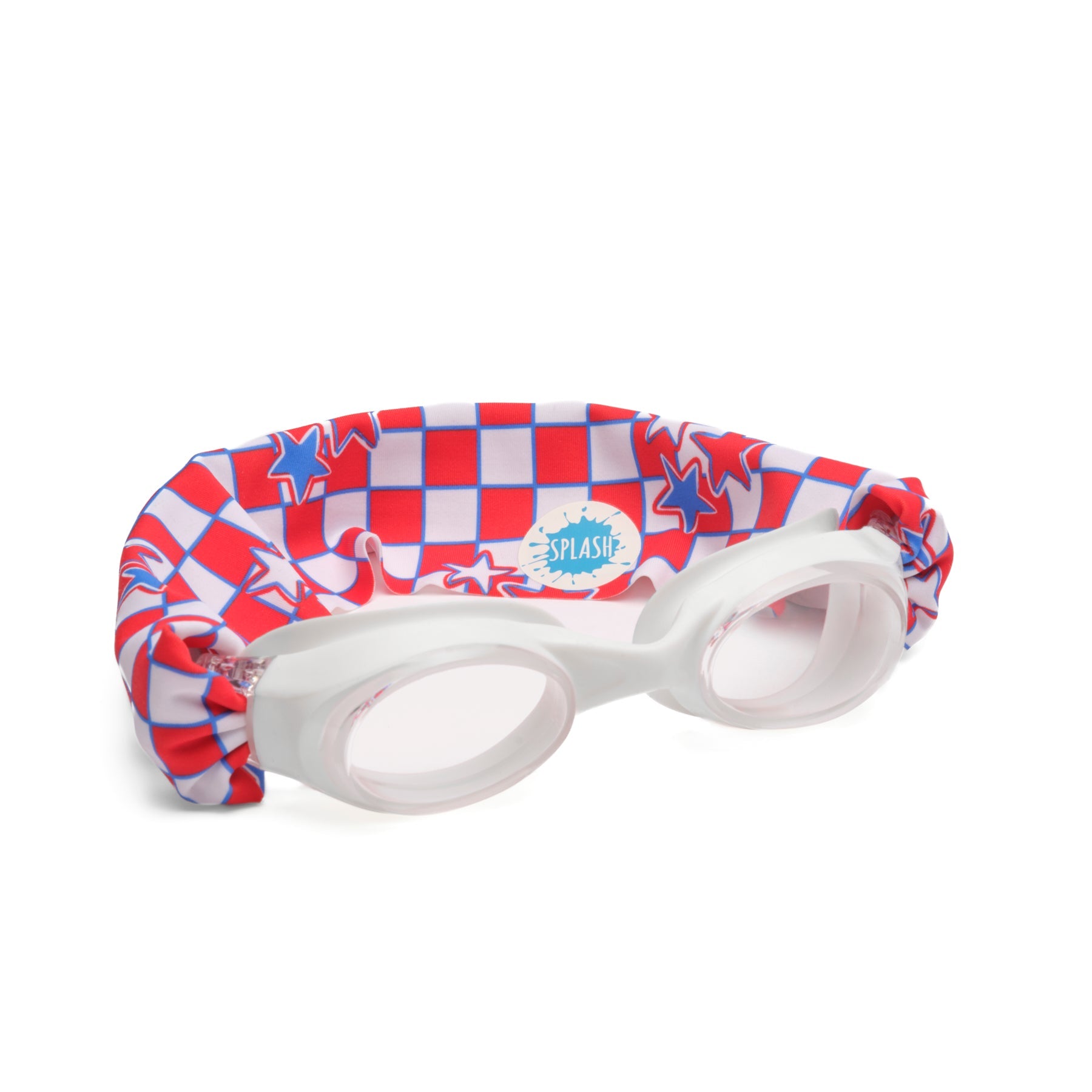 Our American Star swim goggle features our tangle-free strap in a red, white and blue star and checker print. Paired with a white frame and clear lenses.