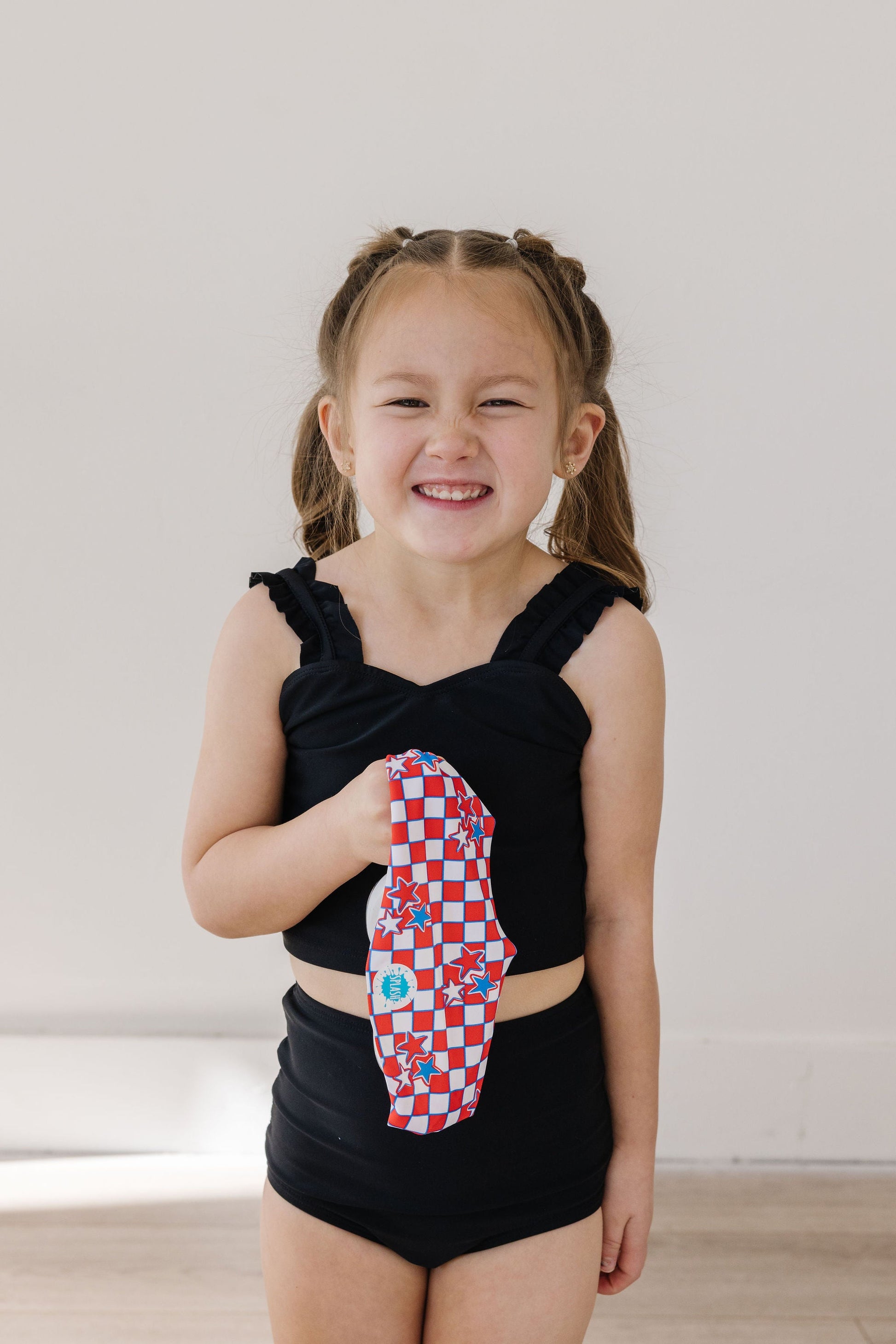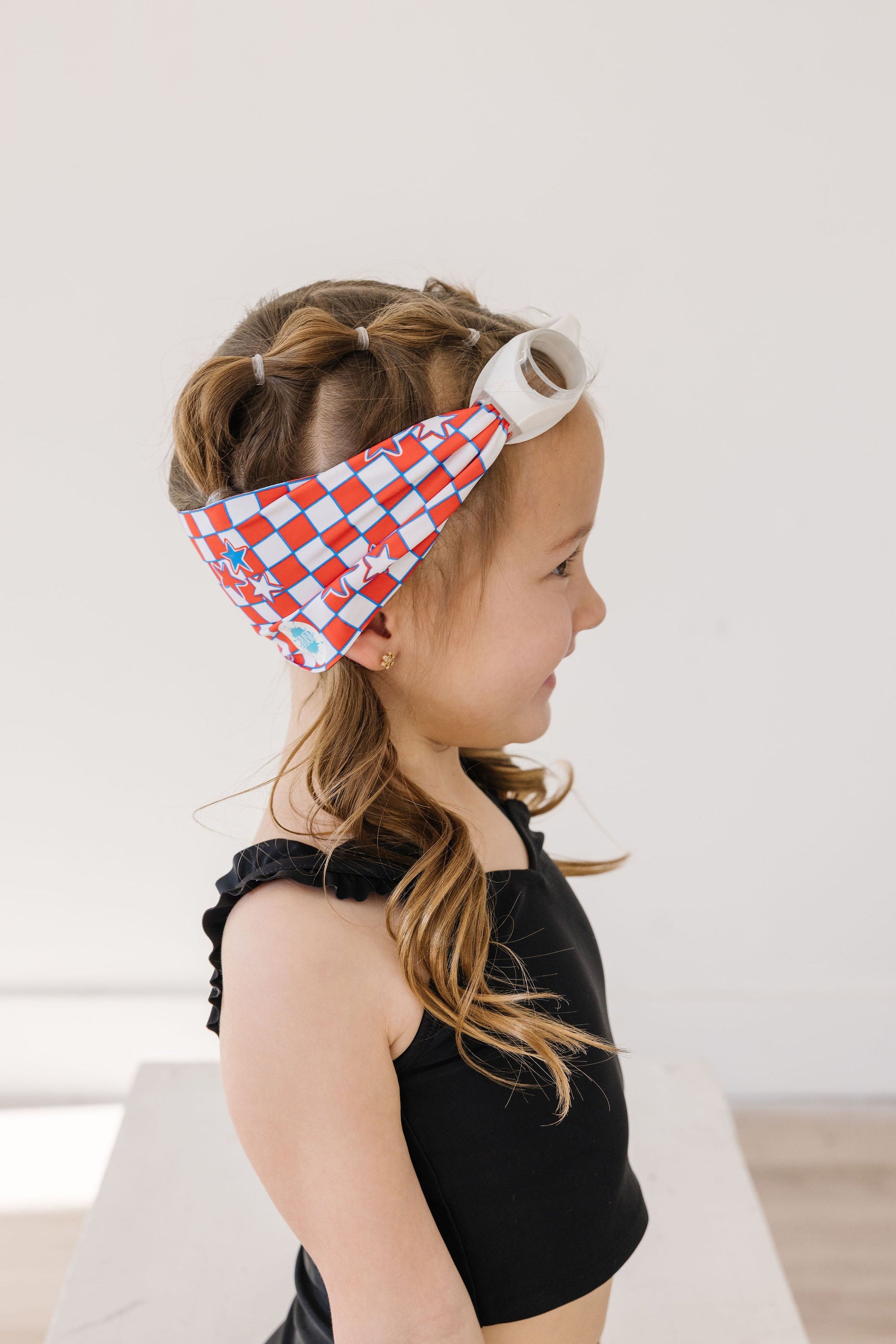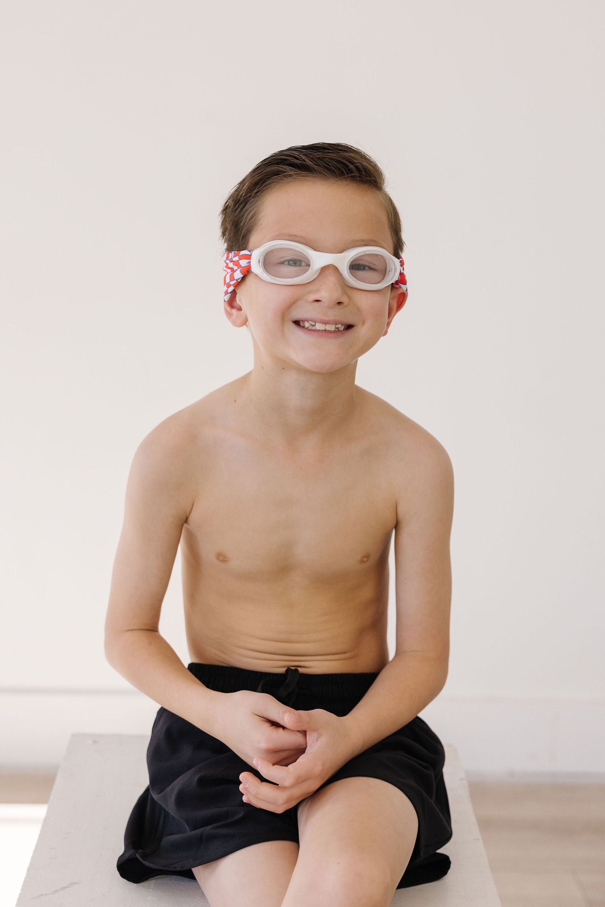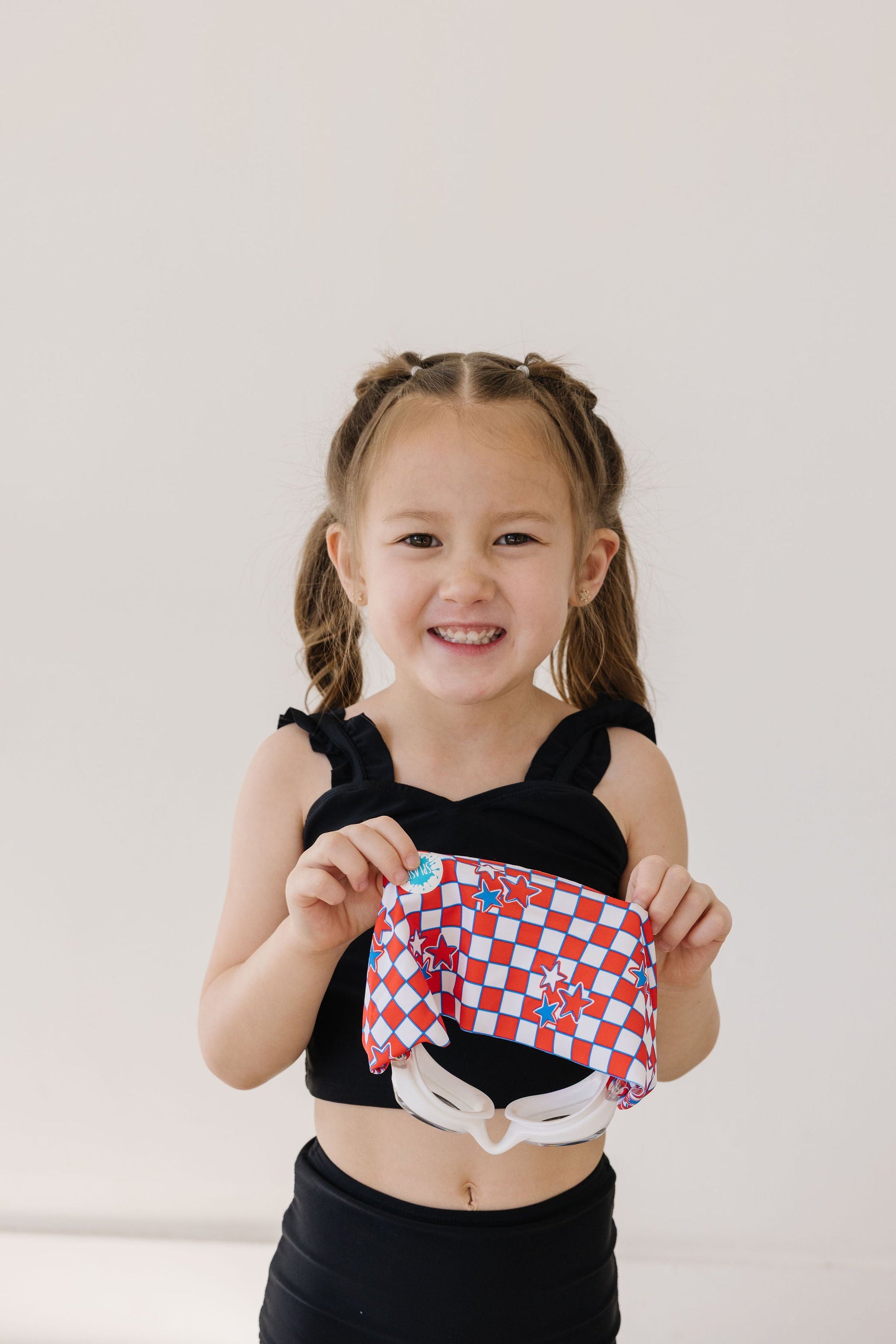 Our American Star swim goggle features our tangle-free strap in a red, white and blue star and checker print. Paired with a white frame and clear lenses.
