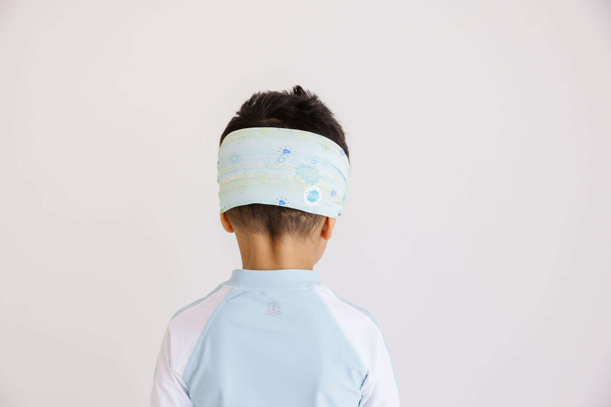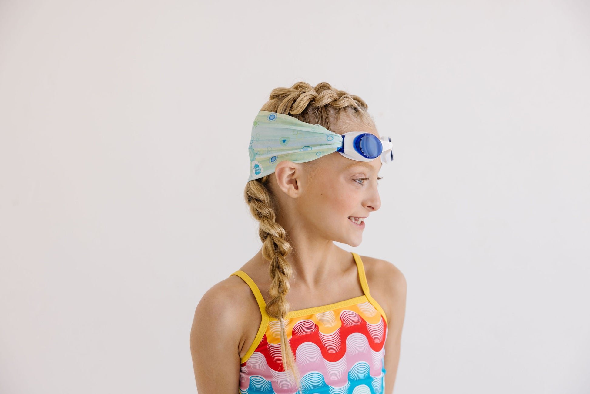 Our Sea Glass swim goggle features our tangle-free strap in a light blue and green print paired with white frames and lightly tinted blue lenses..